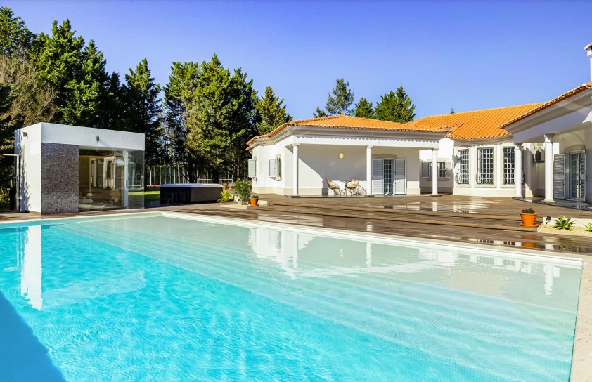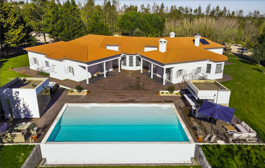 Palmela, Lisbon, Portugal. The 500m² main house features 5 bedrooms (4 en-suite), 2 kitchens, and a social bathroom. Enjoy the outdoors with a tennis field, mini golf, table tennis, children’s playground, infinity pool, sauna, jacuzzi, bar, BBQ, and concert area.